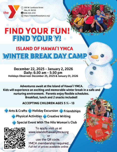 The Island of Hawai’i YMCA New Horizons Summer Youth Program is participating in the Summer Food Service Program. Meals will be provided to all eligible children free of charge. (To be eligible to receive free meals at a residential or non-residential camp, children must meet the income guidelines for reduced-price meals in the National School…